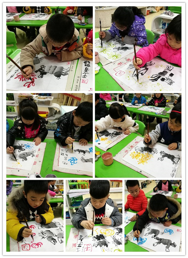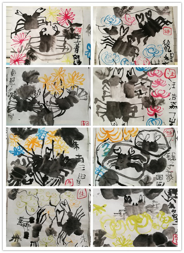 “秋风起,蟹脚痒,菊花开,闻蟹来”,秋天正是螃蟹肥硕的季节,于是带孩子们用水墨来表现螃蟹的神气与威武。 本课主要是让幼儿初步掌握中锋、侧锋的运笔法,尝试表现出浓、淡墨变化画出螃蟹的主要特征,培养幼儿对水墨画的兴趣及大胆作画的能力,同时巩固正确的执笔姿势。 活动开始,利用课件与孩子们一同欣赏螃蟹的特征,让孩子了解螃蟹的组成部分,接着探索如何在毛笔上调出有淡墨和浓墨的效果,侧锋画身体,这是本课的重点,孩子在这一环节掌握得很好,能用浓淡墨画出不同方向的螃蟹身体。在用浓墨中锋画腿、螯、眼时,幼儿也能画出趣味十足的螯,有双举张大的,有两螯相对的,也有一高一低的,可在看似简单的画螃蟹腿时候出现了问题,孩子只知道螃蟹有八条腿,但是没留意腿有几个关节,所以画出来的腿没有什么动感,这需要在以后的教学中提醒幼儿注意观察。在添加背景环节孩子们自由发挥,有的螃蟹与菊花嘻戏,有的螃蟹被盛在盘子里……不一样的螃蟹图,很是有趣。 看看孩子们的作品吧——