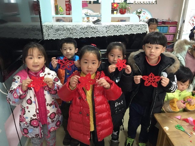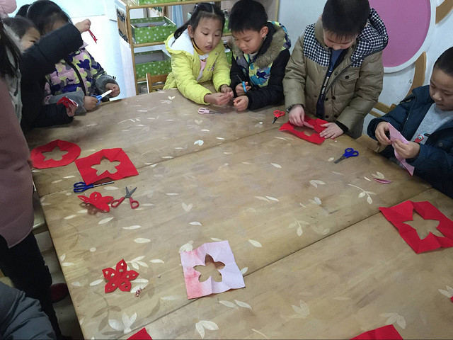 剪纸是我国的民间艺术之一,具有独特技法和趣味性,所以在幼儿园剪纸活动也深受孩子们的喜爱。剪纸不仅能开发孩子的右脑,对于锻炼手眼协调,小肌肉精细动作方面也有很大的作用。通过在剪纸过程中的动脑动手、积极探索,促进幼儿的智力发展。今天我也带领着我们班的孩子们尝试开展一次有趣的剪纸活动。 本次的剪纸的内容是:梅花。我先为孩子们介绍了梅花的特征,让孩子们知道梅花是由五个花瓣组成的。我先示范五瓣花的折法。孩子们都看的很认真。为了让孩子们较快的看到自己的成果。我帮助部分动手能力不是很强的幼儿折好再请他们剪出自己想要剪得图案,让孩子体验成功,激发他们的剪纸兴趣。由于受大班年龄特点的限制,大班孩子还不能较好的掌握剪纸的技能。于是我就不要求他们剪得非常精细,但是孩子们都剪得非常认真,孩子们对剪纸活动都产生了浓厚的兴趣。剪纸的效果也是显而易见的。 我们把孩子们的剪纸作品用来装饰班级环境,为孩子们提供了欣赏展示的机会。不仅使孩子们建立起自信心和成就感,也培养了幼儿对美好事物的向往,提高他们的欣赏美的能力。