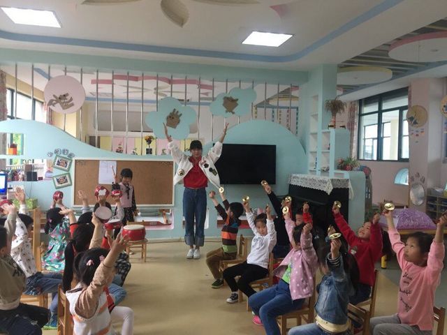 活动反思: 《海盗与船长》是一节非常有意思的打击乐活动,此次活动利用跌岩起伏的音乐,融入海盗与船长相遇后发生“战争”的情境。将游戏贯穿于整个活动之中,“海盗”与“船长”两个不同角色的演绎让孩子们在游戏中感受到音乐带来的快乐。能够根据身体动作的暗示,分别探索铃鼓和拇指镲两种不同乐器两种不同的敲击方法,感受不同的音响效果。在游戏情节进展线索的提示下,累加大鼓进行合乐演奏。本次打击乐活动我是以第二课时来开展的,在第一课时将游戏融入音乐,加上丰富的肢体动作,并进行角色表演。孩子们对游戏的兴趣很高,课后也有孩子告诉我想继续玩这个游戏。在游戏中幼儿不知不觉熟悉了音乐。 本次活动中,孩子们演奏的兴趣一直很高,由于本班幼儿打击乐经验不太强的情况,在活动之前我也在担心这次活动对孩子们来说是不是有很大的挑战,但是孩子们的表现出乎我的意料,加入大鼓演奏的探索很顺畅,说明幼儿真正理解了音乐并感受到了音乐的节奏特点。本次活动的教学效果也较好,本班幼儿在积极探索出为音乐配上合适的乐器后能够根据我的指挥进行演奏。如果在最后环节能让幼儿来担当指挥的角色会更好,就像教科部的强主任说的“做一个“懒”老师,将游戏真正教给孩子” 在本次活动之前我听过董老师同样的一节课,董老师的教学风格也深深的感染着我,董老师对活动细节的处理以及各环节言语的引导也让我获益匪浅。