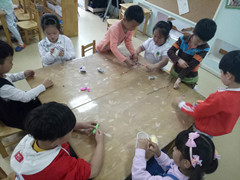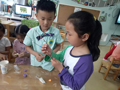 然后带领孩子们利用废旧物品来制作好看东西,我们将之前收集的奶杯制作成花盆,将在童话森林捡来的枯树枝做成好看的花束插在花盆中。