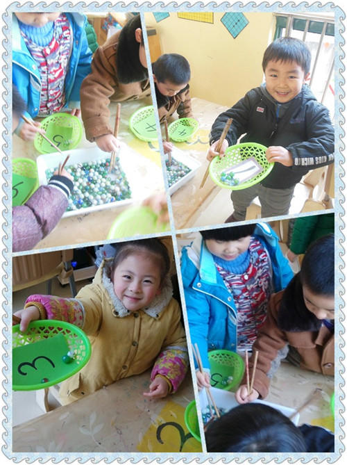 游戏准备:弹珠、筷子、数卡及小篮子若干。