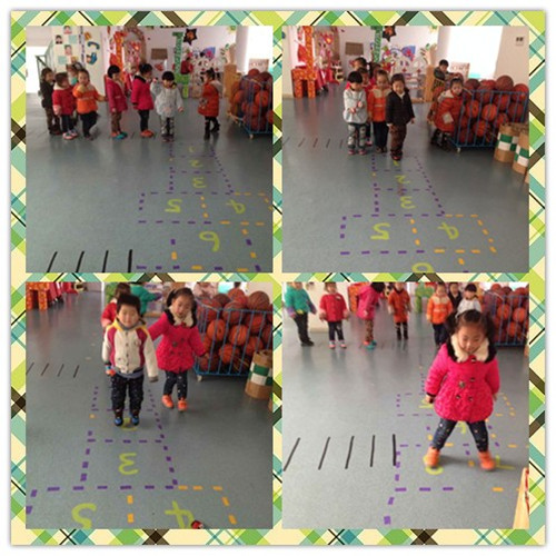跳跳小达人 今天老师带我们来到了二楼的哥哥姐姐班门口玩跳房子的游戏,我们很厉害哦!老师给我们说了游戏的玩法之后,我们就排排队,每人开始了跳房子的游戏。扔沙包很好玩,但一不小心,力气大了或小了沙包都不能被扔进“房子”里。别小看这房子,有的小房子我不小心跳的时候还会踩到线哦。不过没关系,相信我们玩多了,小腿上的力量就会发展起来的。