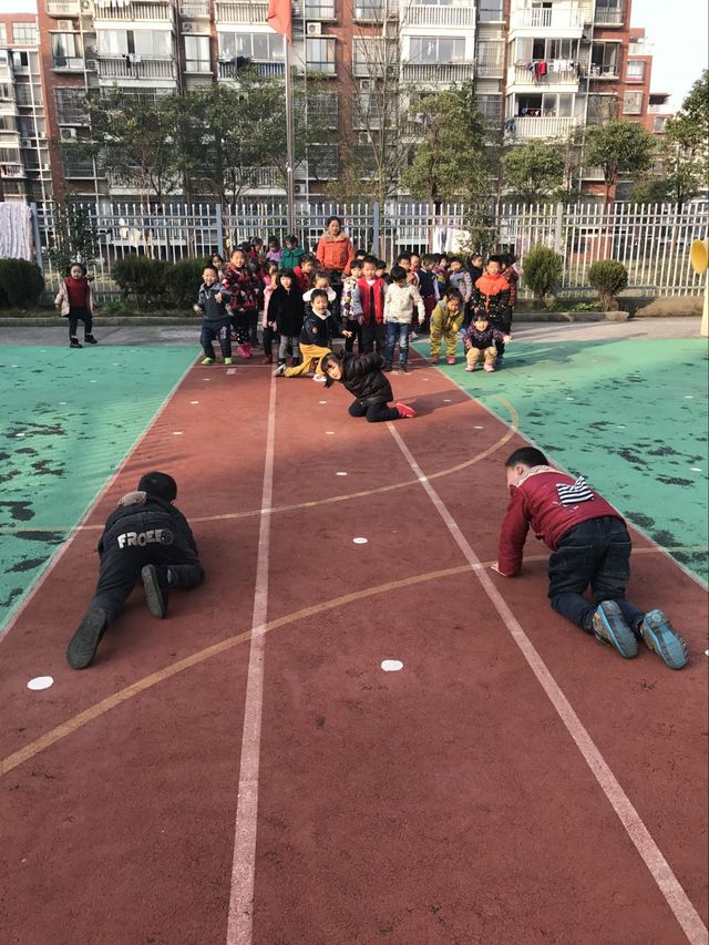 游戏目标: 1、发展幼儿动作的协调性和灵活性,锻炼幼儿爬行、平衡等能力。 2、乐意参与体育游戏,培养幼儿的规则和竞争意识。 3、培养集体荣誉感和合作意识,学习欣赏、鼓励同伴。 游戏准备: 沙包四个、起点、终点线 游戏玩法:幼儿分四队站在起点线后,排头幼儿在地上呈“乌龟”爬行状准备,同伴将沙包放在幼儿(“乌龟”)背上驮起,开始口令后,幼儿(“乌龟”)驮沙包至终点再返回,和同伴击掌交接再退回队尾,最先整队完成的为胜。沙包若中途掉落,需捡起放背上。 反思:孩子们虽已了解玩法,但规则意识不强,常常没到终点就返回,返回后又不会击掌传递,因为游戏人数较多,孩子们常不听指挥,随意换队或自由活动,导致游戏不得不中止,待调整好队伍后再继续。虽问题颇多,但孩子们的参与热情还是很高的,能鼓励同伴,帮同伴加油,有竞争意识,爬行及平衡能力也得到了一定的发展。