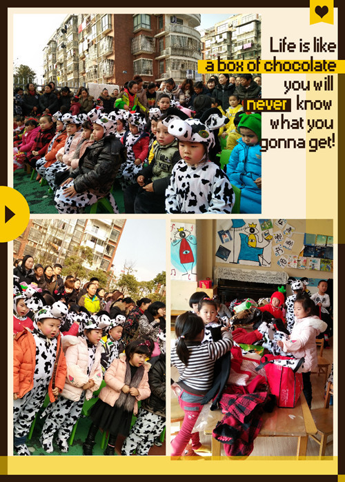 2016年12月29日中午,孩子们吃完午饭散完步就开始为下午的表演做准备。大家先换好自己的演出服装,然后洗了一个脸。最后开始化妆了!一听到化妆,孩子们别提有多高兴了。历经了一个多小时的准备,孩子们一个个的画好了妆容。当然这个时候爸爸妈妈也来到了班级。孩子们看见了爸爸妈妈。开心的和爸爸妈妈一起照相,庆祝! 2:20分,孩子们和爸爸妈妈来到了操场上开始候场!准备表演自己的节目!第一个,第二个,第三个……终于迎来了我们的第一个节目《牧场乖乖》,孩子们脱下棉衣,穿好演出服装整装待发,听到主持人报幕后,孩子们一个个穿着可爱的奶牛服在操场上踩好点。音乐开始,孩子们开始表演啦!