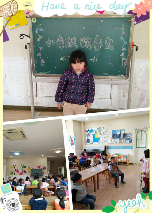 小青蛙故事会 亲爱的小朋友们,你们知道4.23日是什么节日吗? 对了,就是我们一年一度的读书日。今年的读书日又将来临,为了让我们更好的感受书香,感受阅读,感受语言带来的魅力!4月初,我们的班级开展小青蛙故事会,我们亲爱的老师让我们每位小朋友回家准备一个故事!于是我们回家告诉了我们亲爱的爸爸妈妈! 看看,我亲爱的爸爸妈妈们为我们准备了各种故事!这些都是我亲爱的爸爸妈妈们为我们准备的故事电子稿。刚开始,我们也不会。每天爸爸妈妈教我几遍,渐渐的,我就会了。 接下来就是我上台表演的时刻了。 每天我亲爱的老师都会请几名小朋友上台讲故事,每位小朋友的故事都很精彩!有的小朋友的故事很长,但他们口齿清晰,表达清楚,普通话标准,故事内容熟记于心!有的小朋友还可以用不同的语气表演不同的角色说话内容。还有的小朋友声音清脆洪亮!我很喜欢听他们的故事!听了一遍还想再听一遍。 不过也有的小朋友说的故事我不爱听,可能是爸爸妈妈没有给他们准备好。也可能是他们胆小,上台后就忘记了!希望这样的小朋友再接再厉哦!