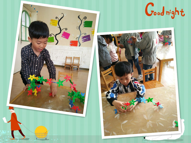 游戏效果:在合作做桥的过程中,每位幼儿都有自己的想法,有的组的幼儿能够将自己的想法说出,大家一起探讨如何将桥制作成功,而有的小组的幼儿材料一发下去就开始争抢,将所发的材料据为己有,不愿意与别人合作。其中第三组的幼儿大家一起有说有笑的完成了本次的活动,首先他们组商量制作一座悬索桥,然后每两人制作一个桥墩,桥墩上带点桥面,最后将所有的桥墩与桥面连在一起,他们用时最短,合作最好。第二小组刚开始大家商量着做拱桥,于是大家一起制作拱桥,在制作的过程中发现桥立不起来,只要一松手桥面就倒了。于是我引导他们如何将桥立稳?他们思考过后觉得应该需要一个稳健的桥墩,这样才可以将桥立起来。在活动中有一个小组的幼儿大家各自拼自己的,有的孩子没有拼好就抢别人的雪花片,最后时间到了也没有完成。 |