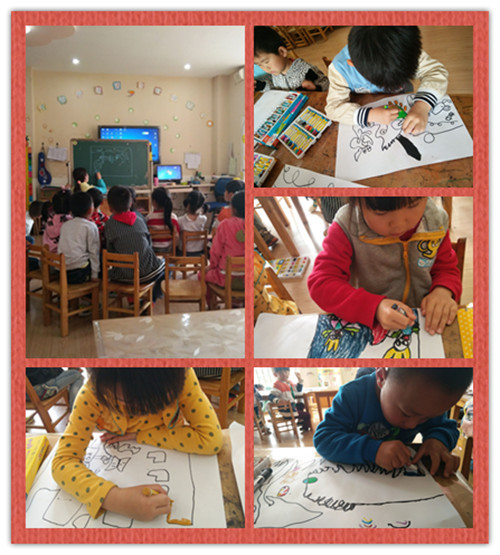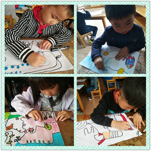 活动小结:在上节语言绘本《跟着线走》的基础上,幼儿对绘本内容有了一定的了解。因此本节 活动《跟着线走》每个孩子都有自己的想法,并且能够在幼儿面前大胆的表达出来,但个别幼儿会用语言表达,不会用手中的“线”将所表达的内容画出来。而有的幼儿则可以运用手中的“线”,将所有的想表达的内容画出来。作品完成时,每个幼儿都有自己的想法。每个幼儿的旅行方法与地点都不一样。体现了幼儿的个性化。