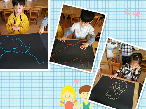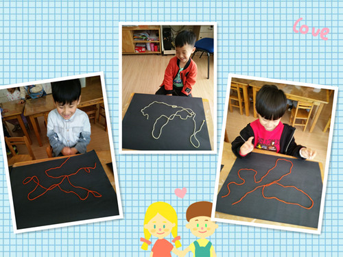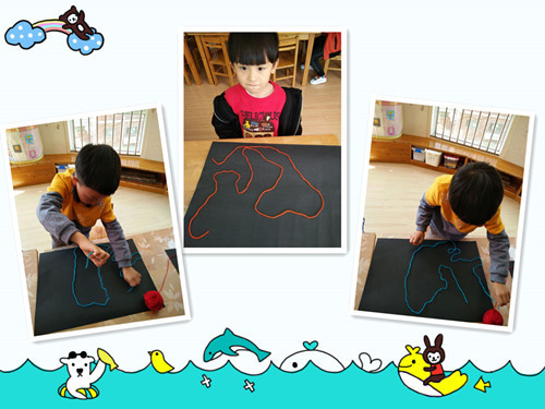 游戏效果:大部分幼儿在拿到绳子和纸之后特别的开心,然后开始进行创作。每次能创作各种各样的造型,并且能够说出造型的名称。但有的幼儿拿到绳子后便在手上打转,不会自己玩。 |