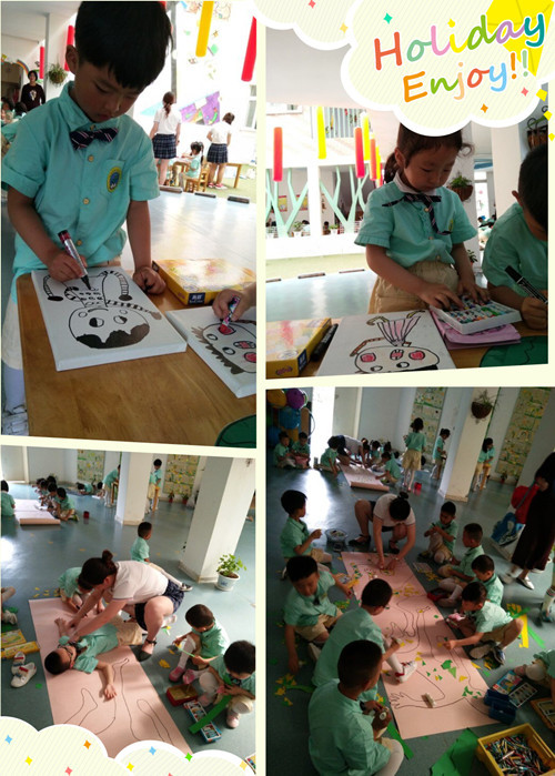 快乐六一 “六一、六一,大地穿上花衣,小朋友们手拉手庆祝自己的节日……我们唱歌跳舞庆祝六一!”伴随着“庆祝六一”的歌声。一年一度的六一国际儿童节又一次来临。每年的六一儿童节是孩子们最喜欢也最期待的事情!当然,为了让每个孩子都可以感受到过六一的快乐。前几周我们就根据孩子们的兴趣爱好和孩子们共同准备!本周,我们开展了一系列的活动来庆祝六一节! 活动一:创意美术——美美美 周四下午3:20,我们带着自己的油画棒,记号笔,固体胶等材料来到了一楼大厅,进行创意美术《舞动的小人》及《小小的我》。看看我们在认真的剪、贴、画、涂!半小时后,我们的作品完成了,哈哈,我们这里有个人画与组合画哦。我们在创作的过程中享受着快乐!在快乐的时光中进行创作!