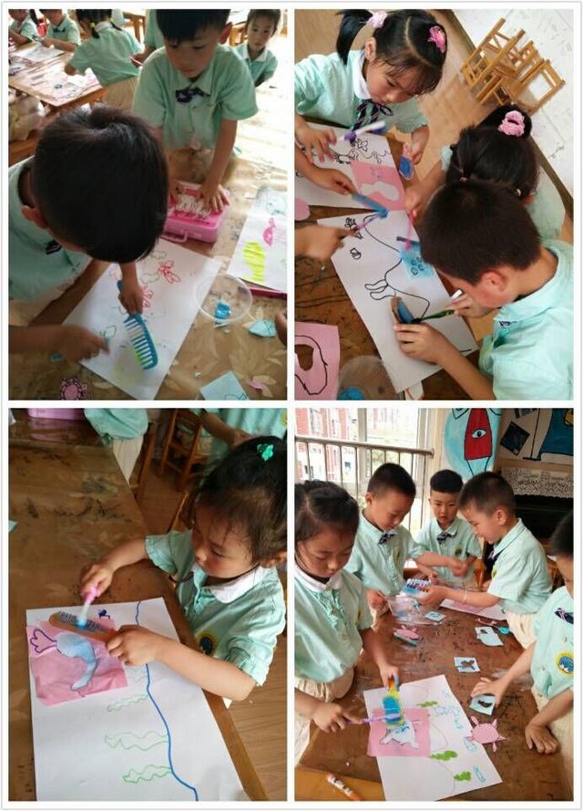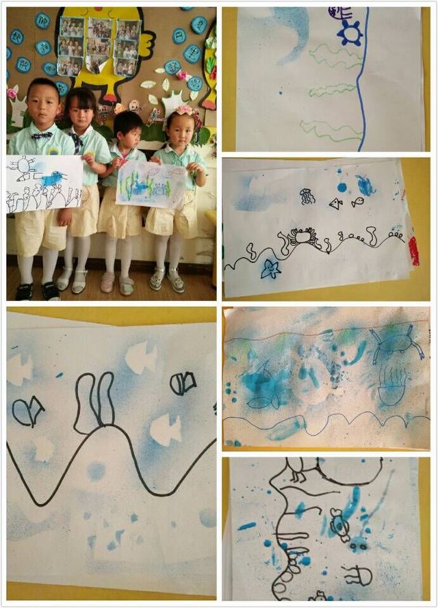 水彩喷画——合作的魅力 这段时间我和孩子们一起看小水滴,当我们看见艺术领域时,孩子们对海里的大鲸鱼开始感兴趣。于是我和孩子们开始了喷画之旅。 首先我们每个宝贝准备了牙刷和梳子,其次就是要准备的海景背景图及海洋生物等! 我先引导孩子学会制作海底生物的模板,方便后期的喷画制作。 当然,这次我们改变了以往一个小朋友作画的方式,而是两个小朋友一起合作!活动中,我先讲述了本次作画的要求!一位小朋友负责绘画背景,一位小朋友负责制作海底生物!谁来做?如何分配则需要小朋友自己商量。我把这种商量的机会给了孩子们!商量好的幼儿到我这领取制作材料,没有商量好的幼儿则继续商量,不能到我这领取材料! 活动开始,孩子们量量组合。在孩子们商量好后,孩子们开始了自己的喷画之旅。大部分的孩子都商量好了,有三组幼儿没有商量好!其他组的幼儿各自分工,开始制作!这三组的幼儿看见了别的组开始制作有些着急。后期也加快了速度进行商量。 看看孩子们的作品!虽然没有大人眼中的完美,但这是孩子们两两合作完成的作品。大家在合作中既完成了作品,也提升了幼儿之间的友谊!
